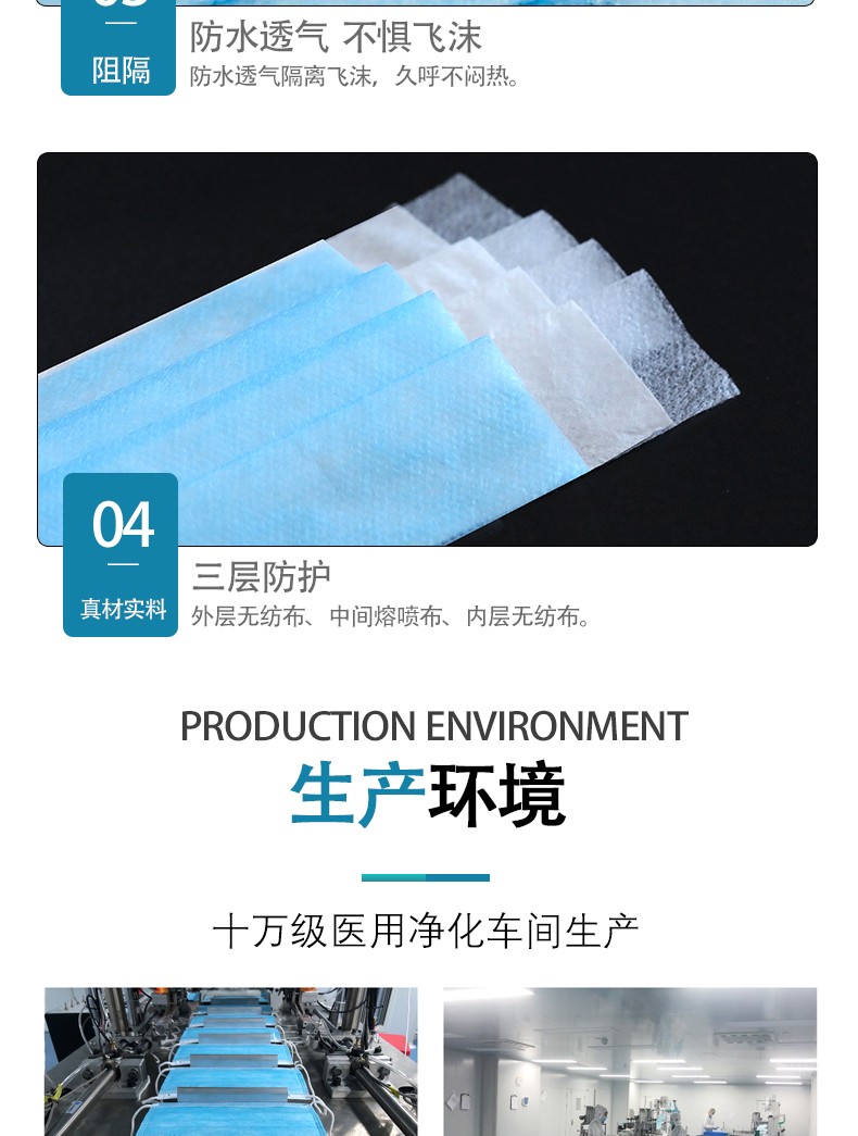 【結構組成】一次性使用醫用口罩由口罩體、鼻夾和口罩帶組成,口罩體由無紡布和熔噴布制成。一次性使用醫用口罩在10萬級潔凈間生產,未經消毒處理微生物指標符合技術要求。